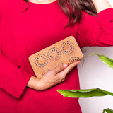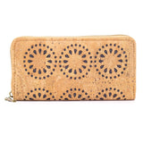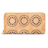 A Laser cute style cork wallet 8 card slots, 2 bill pockets, one zipper pocket for your coins and one space that you can fit your papers or tickets.