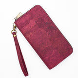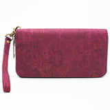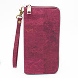 Portefeuille en liège couleur Bourgogne structuré avec une dragonne en liège assortie à la couleur du portefeuille, 8 emplacements pour cartes, 2 poches pour billets, une poche pour fermeture à glissière pour vos pièces de monnaie et un espace pour vos papiers ou billets.