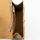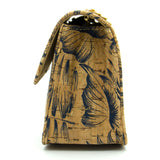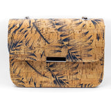 Un sac à main en liège structuré avec une lanière en chaîne dorée, un fermoir magnétique et un magnifique motif.
